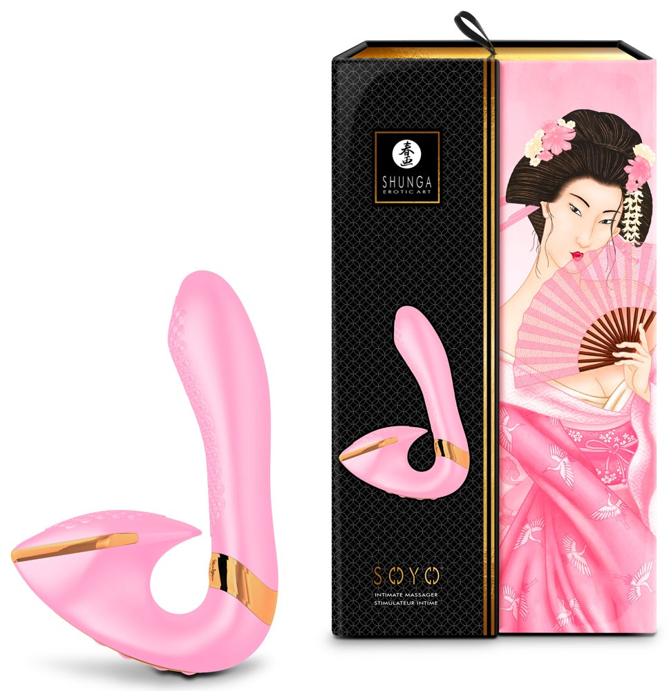 Vibratore Soyo di Shunga dal design sofisticato ed elegante per coccolare contemporaneamente la vagina, le labbra della vulva e il clitoride.